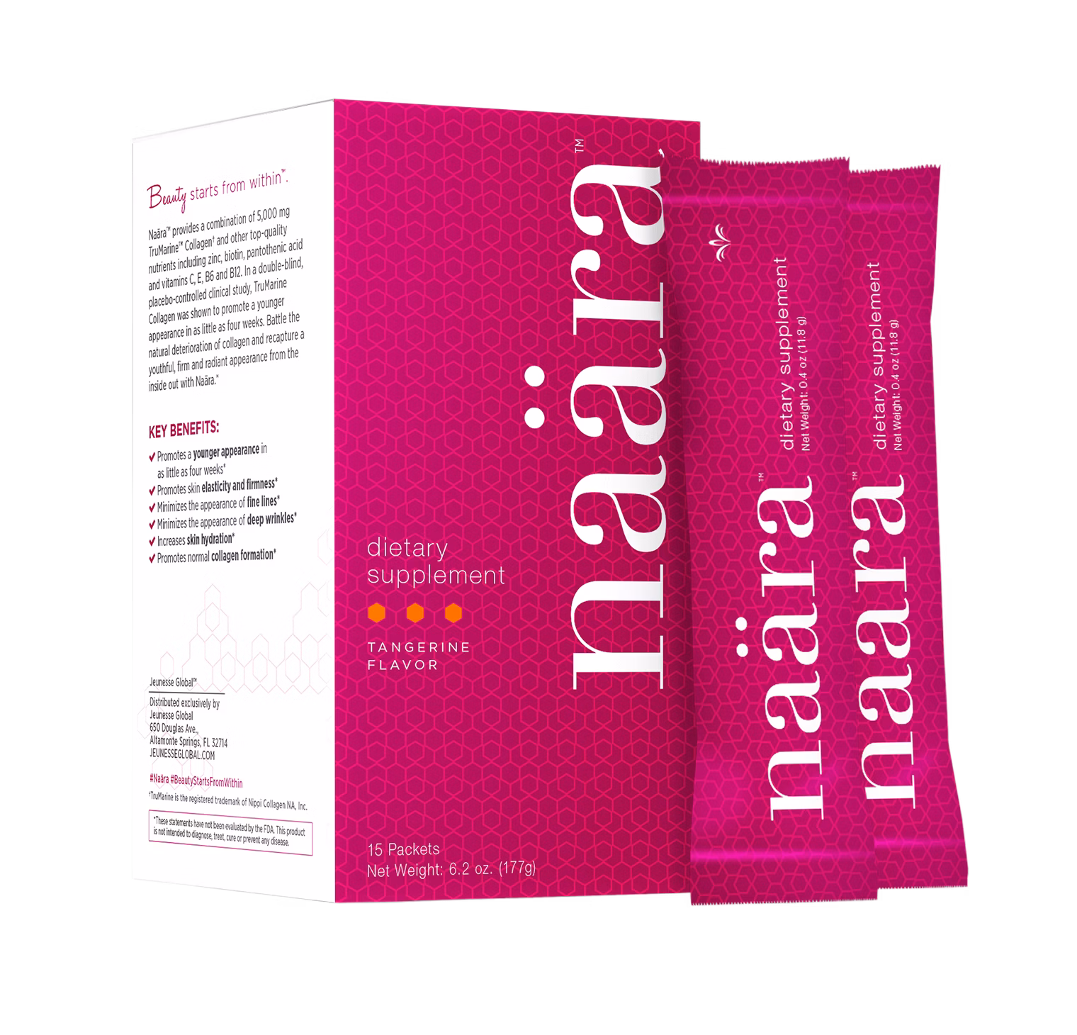 Naära® Beauty Drink ist ein Nahrungsergänzungsmittel, das 5.000 mg hydrolysiertes Kollagen in einem Beutel mit schönheitsfördernden Nährstoffen kombiniert, um jugendlich aussehendes Haar, Haut und Nägel zu unterstützen.